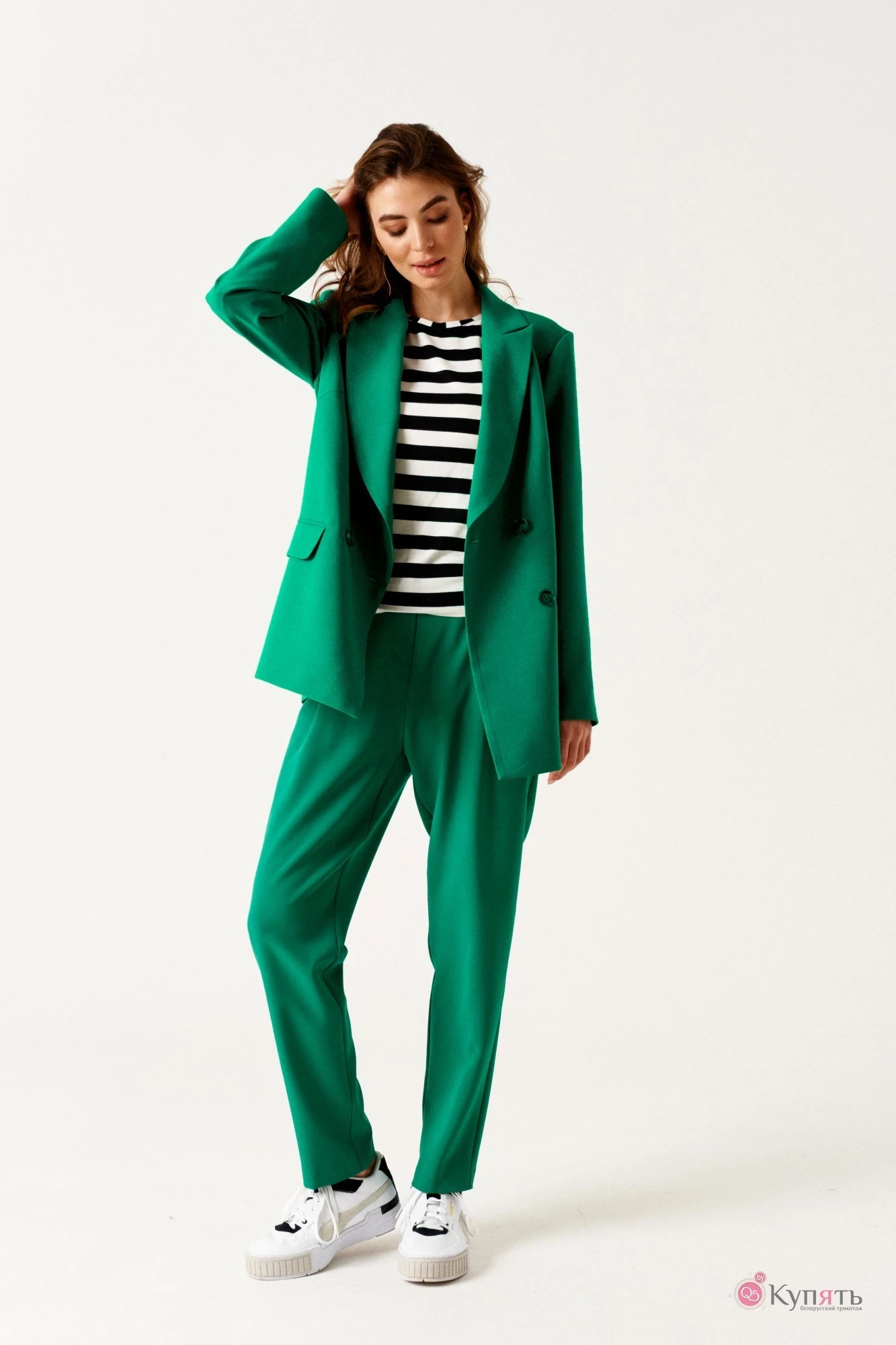 Жакет женский двубортный, свободного силуэта, длиной ниже линии бедер, из костюмной ткани. Перед с двубортной застежкой на петли, пуговицы, с нагрудными вытачками, прорезными карманами в рамку с клапаном. Спинка с центральным швом заканчивающийся шлицей. Рукав втачной, двухшовный, длинный. Воротник отложной пиджачного типа. Жакет на подкладке.