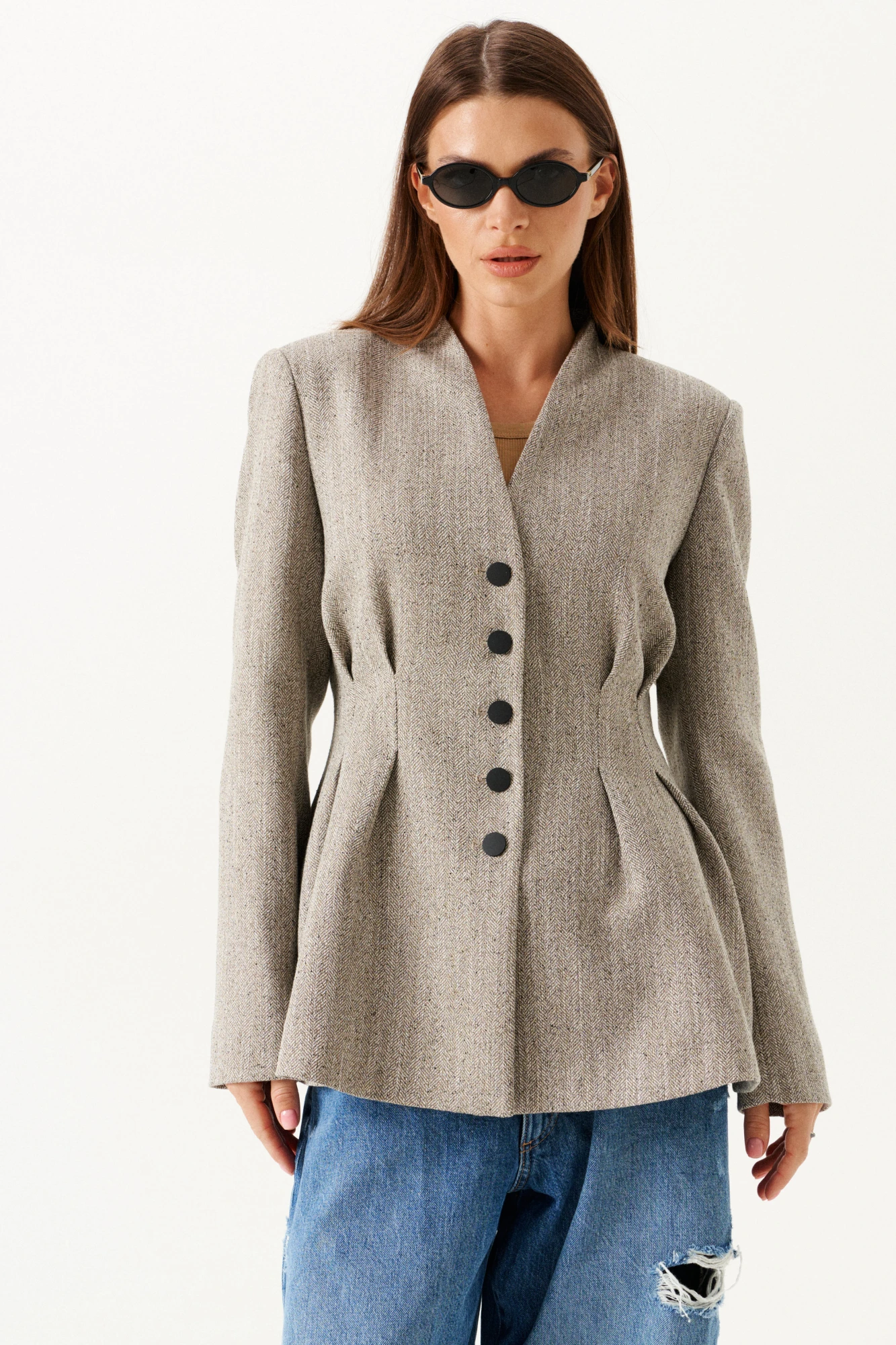 Жакет женский из пальтовой ткани, приталенный, с центральной застежкой на петли и пуговицы, на подкладке. По переду и спинке заложены односторонние складки, формирующие силуэт песочных часов. Спинка со средним швом. Воротник – цельнокроеная стойка. Рукав втачной, двухшовный, длинный.