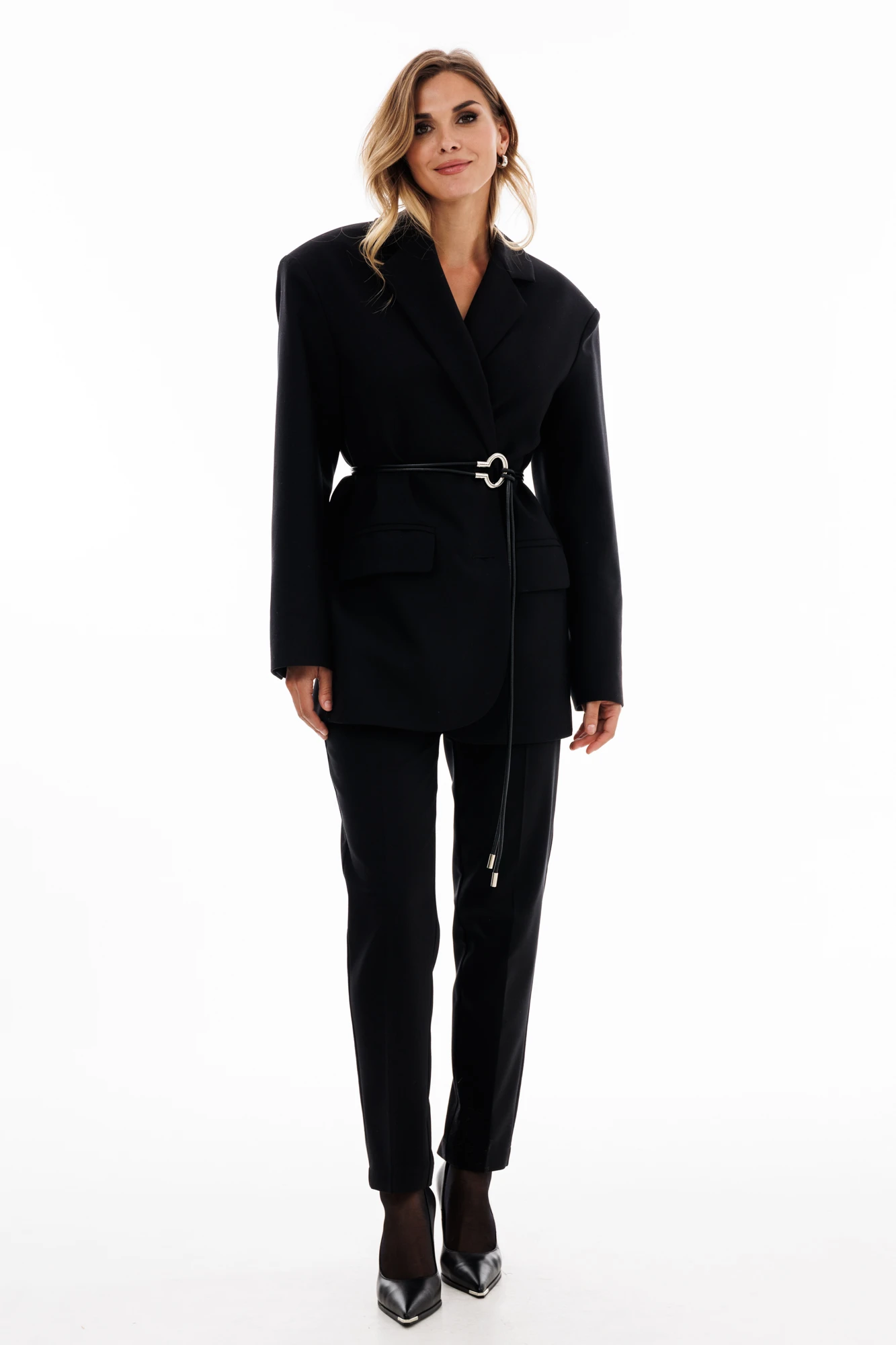 Жакет выполнен из костюмной ткани. Жакет прямого силуэта, длиной ниже линии бедер, покроя ""oversize"". Спереди под лацканами прорезные карманы с клапанами. Центральная бортовая застежка на пуговицы. На спинке средний шов и шлица. Воротник пиджачного типа. Плечевой шов удлинен. Рукав втачной, двухшовный, со шлицей по низу, застегивающейся на пуговицы. Жакет на притачной по низу подкладке. Ремень в комплект НЕ ВХОДИТ.