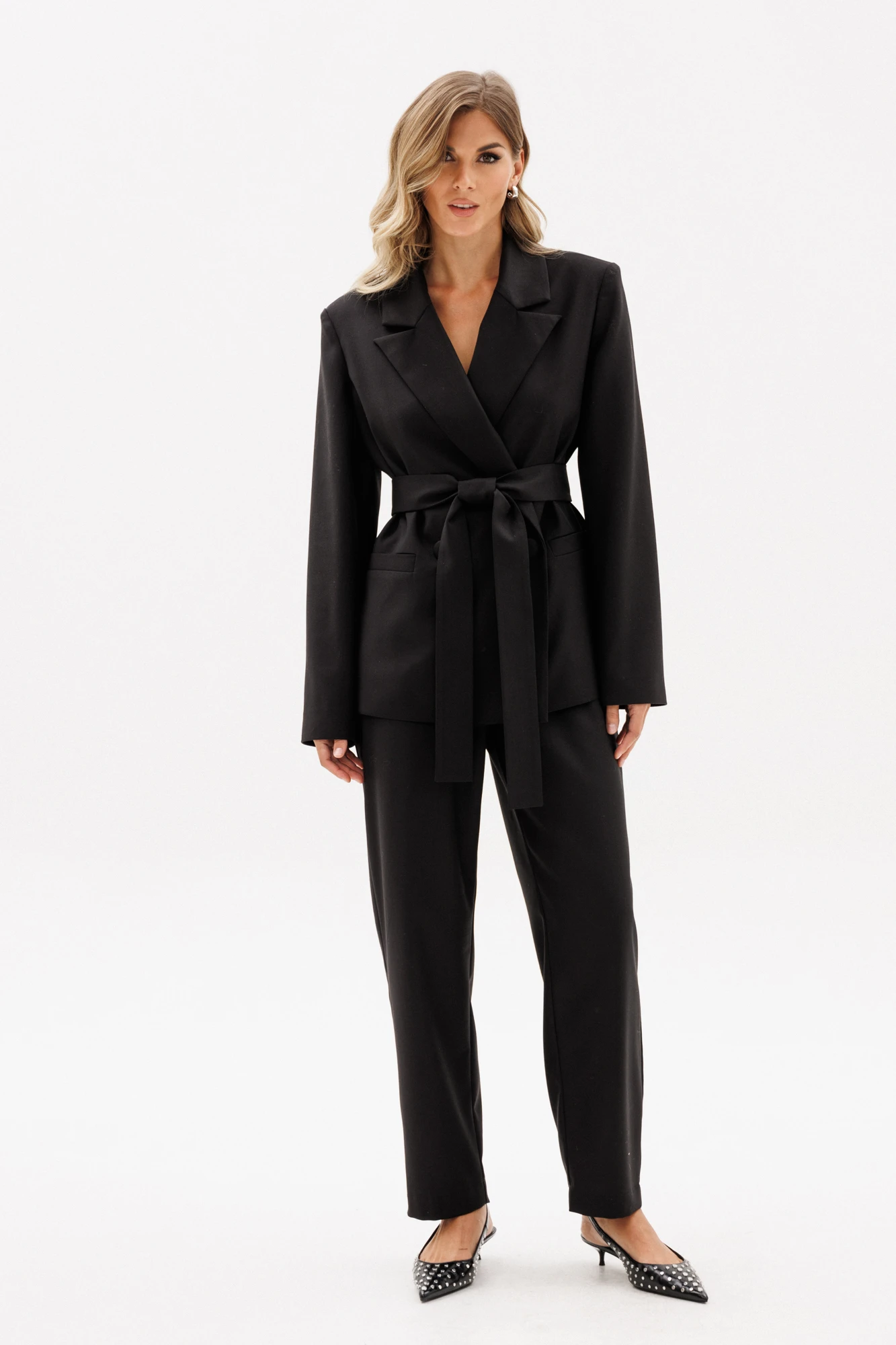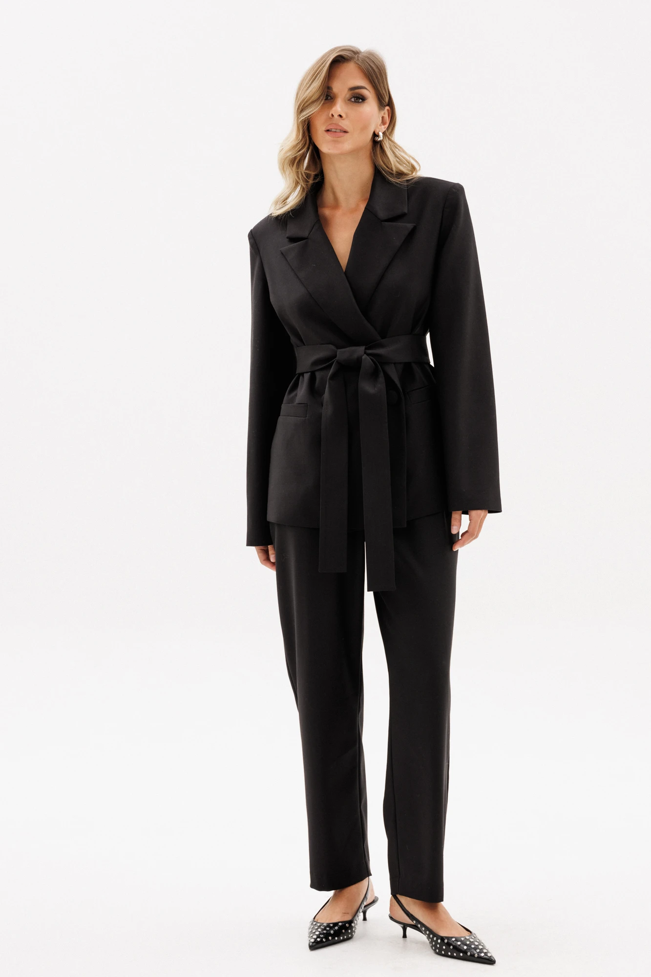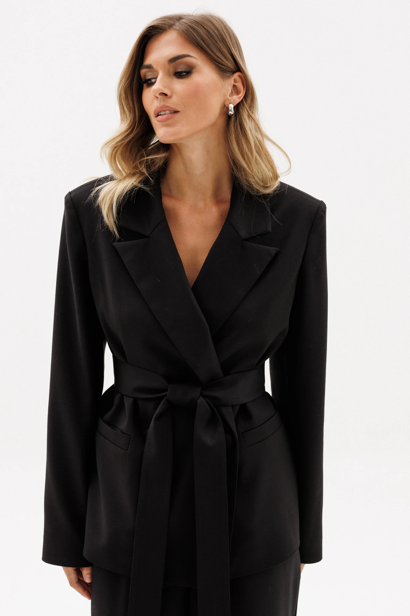 Жакет выполнен из костюмной ткани. Жакет прямого силуэта длиной до линии бедер. Спереди лацканы. Застежка двубортная на обтяжные пуговицы. Воротник пиджачного типа. Спинка со средним швом. Рукав втачного, двухшовный. Жакет на притачной по низу подкладке. В комплект входит съемный пояс из основной ткани.