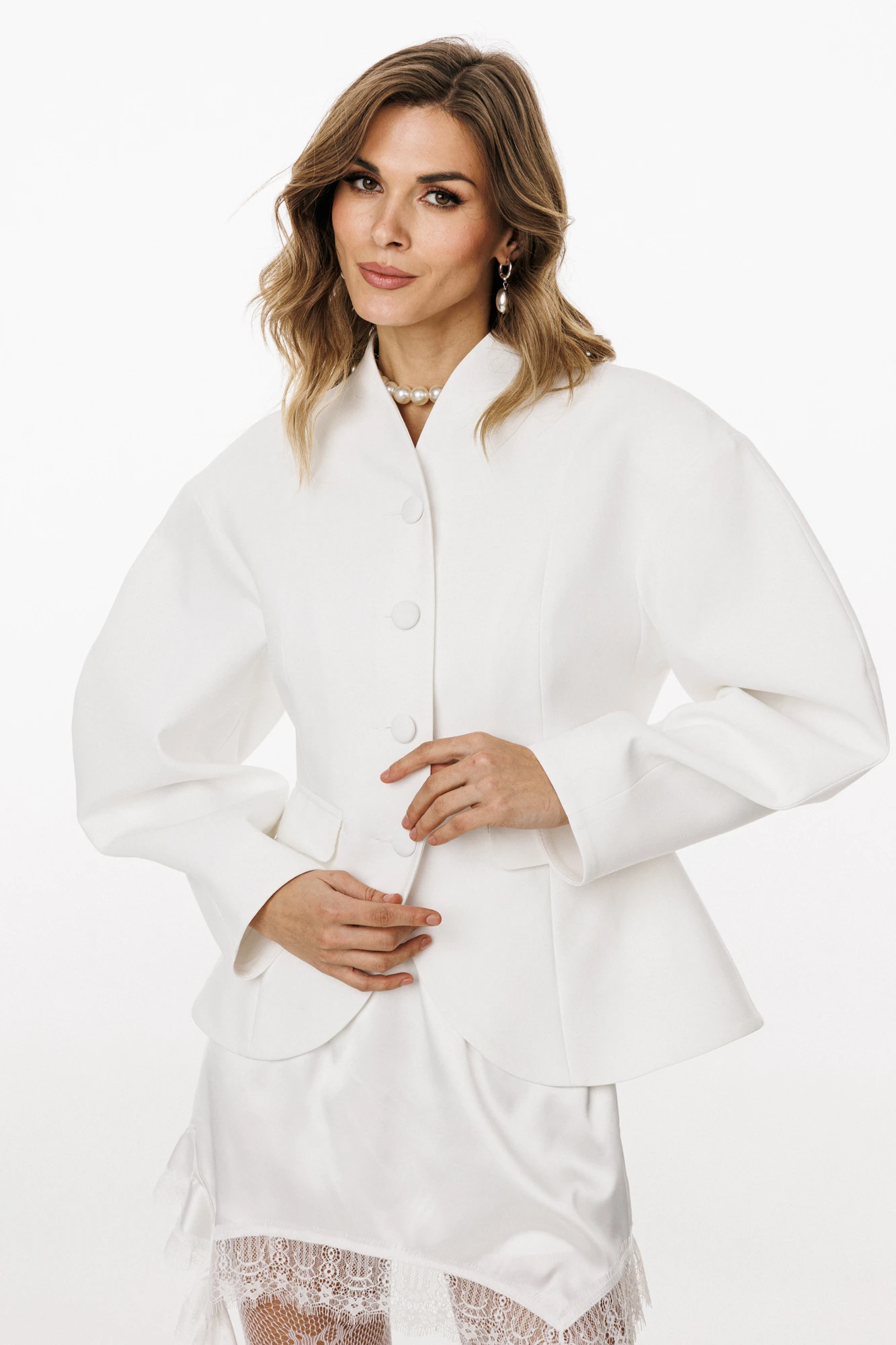 Жакет выполнен из костюмной ткани. Жакет О-образного силуэта, длиной до линии бедер. По переду обработаны рельефы от плечевого шва до низа, прорезные карманы с клапанами, и центральная бортовая застежка на 4 петли и пуговицы. Низ борта округлой формы. На спинке обработаны два рельефа от горловины до низа и средний шов. Горловина округлой формы, обработана цельнокроеным воротником-стойкой. Плечевой шов удлинен. Рукав фигурной формы, двухшовный, заужен к низу. Жакет с плечевыми накладками.