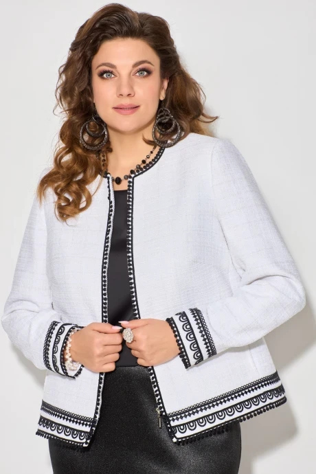 Нарядный жакет "Асфея" на подкладке, полуприлегающего силуэта, выполнен твидовой ткани с блестящей нитью. В жакете застежка на металлическую молнию, вырез горловины округлый, по спинке и полочке рельефы. По низу рукава и по низу жакета нашита декоративная тесьма, по борту и горловине тоже настрочена декоративная тесьма. Это очень стильный жакет из дорогой изящной ткани! В комплекте идет брошь.
