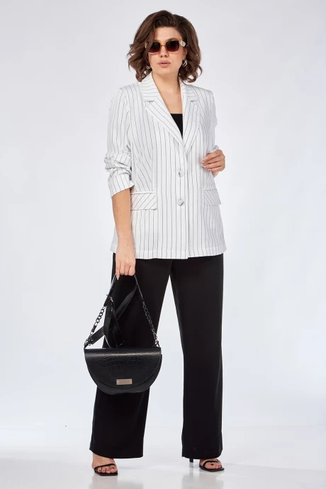 Жакет женский изготовлен из легкой костюмной ткани, без подкладки, полуприлегающего силуэта. Горловина оформлена воротником пиджачного типа, застежка центрально-бортовая на две петли и пуговицы. Перед с подрезными бочками и талиевыми вытачками. Карманы прорезные, с клапаном и двумя обтачками. На спинке средний шов со шлицей внизу. Рукава втачные двухшовные с разрезом по низу.