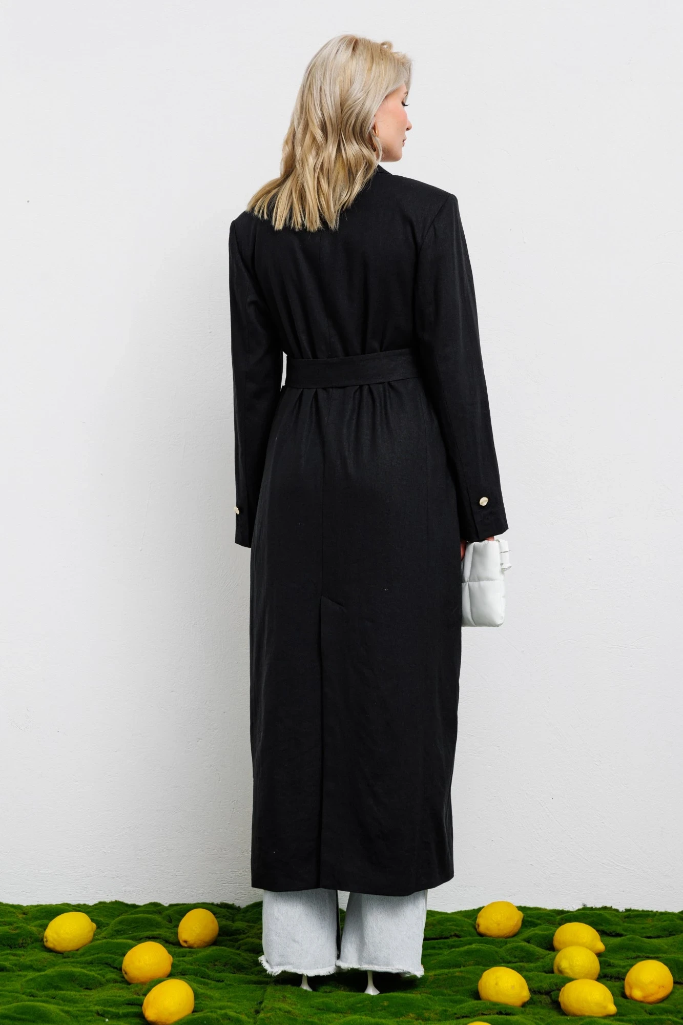 Жакет в пол — однобортный, прямой, с четкой линией плеча, похож на мужские модели, но делает образ женственным. Выполнен из плотного льна на хлопковой подкладке. Для него предусмотрен длинный пояс, который поможет подчеркнуть талию. По низу высокая шлица для удобства при ходьбе. Комбинируйте с брюками или джинсами. Длина - 134 см.