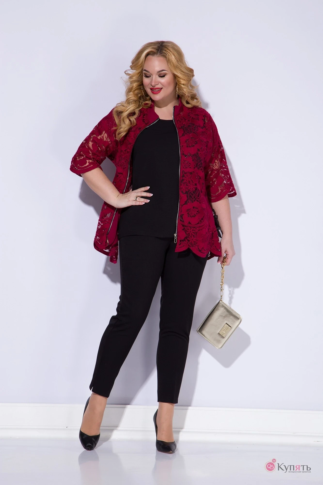 Эффектный нарядный жакет в яркой сочной расцветке. Модель выполнена из хлопкового набивного кружева. Жакет прямого силуэта, с центральной застежкой на металлическую молнию. Рукав в модели спущенный, вточной длиной ¾-ти. Воротник на стойке из отделочной ткани. Спинка на двойной кокетке. По переду расположены прорезные карманы с обтачкой. Сбоку декоративные разрезы с контрастной лентой на бант.