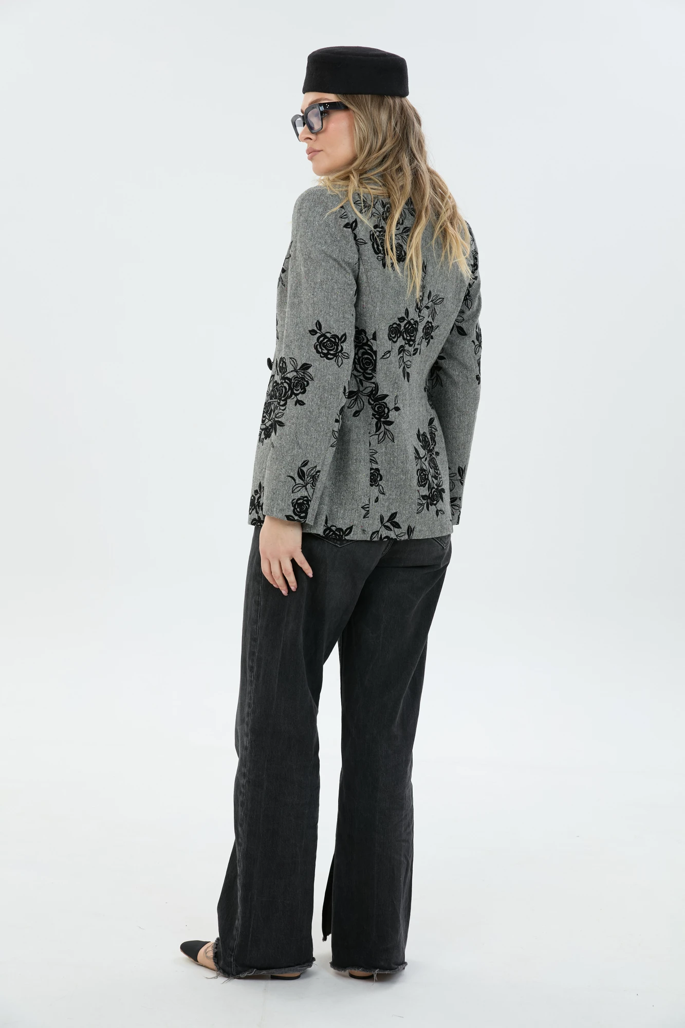 "Жакет двубортный умеренного объёма из мягкой ткани. Застёжка на две пуговицы. По бокам расположены функциональные прорезные карманы с клапаном. Жакет на подкладке.