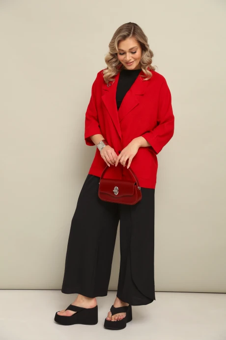 Жакет большого объёма с двубортной застежкой по одной стороне на петли и пуговицы. Рукава 3/4 с манжетами. Жакет без подкладки. По переду расположены накладные карманы. Длина жакета по спинке 70-72 см.