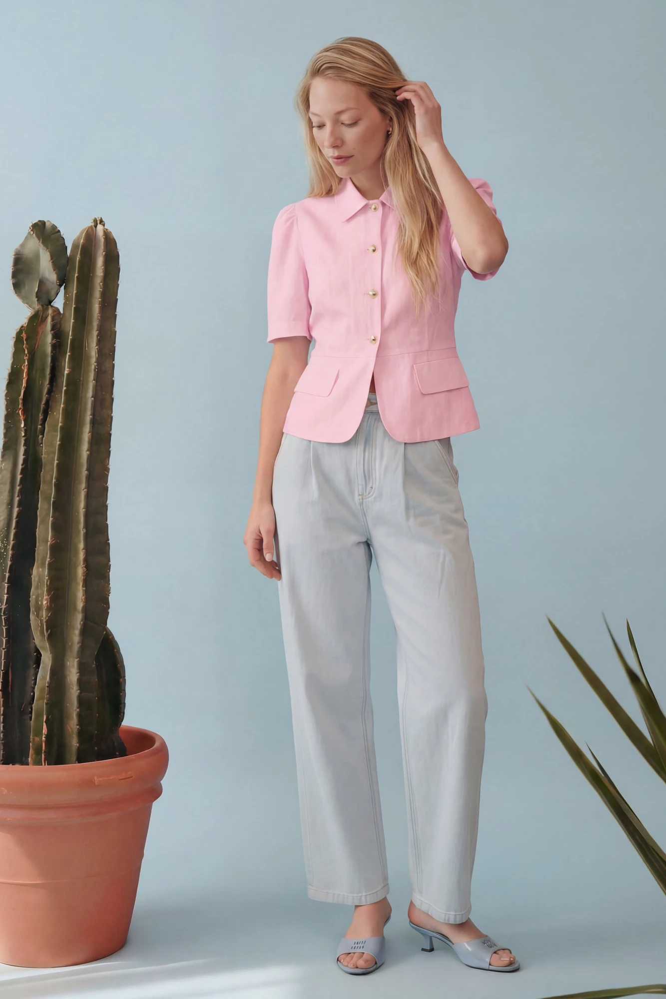 Жакет выполнен из льняной ткани, без подкладки. Рукав короткий со сборкой по окату. Классический рубашечный воротник на стойке, застёжка центральная на петли и пуговицы. По переду вертикальные рельефы, линия талии отрезная с притачной баской, которая мягко раскрывается книзу, создавая баланс между структурой и легкостью. По баске декоративные клапаны по бокам. По спинке: средний шов, рельефы и баска.
