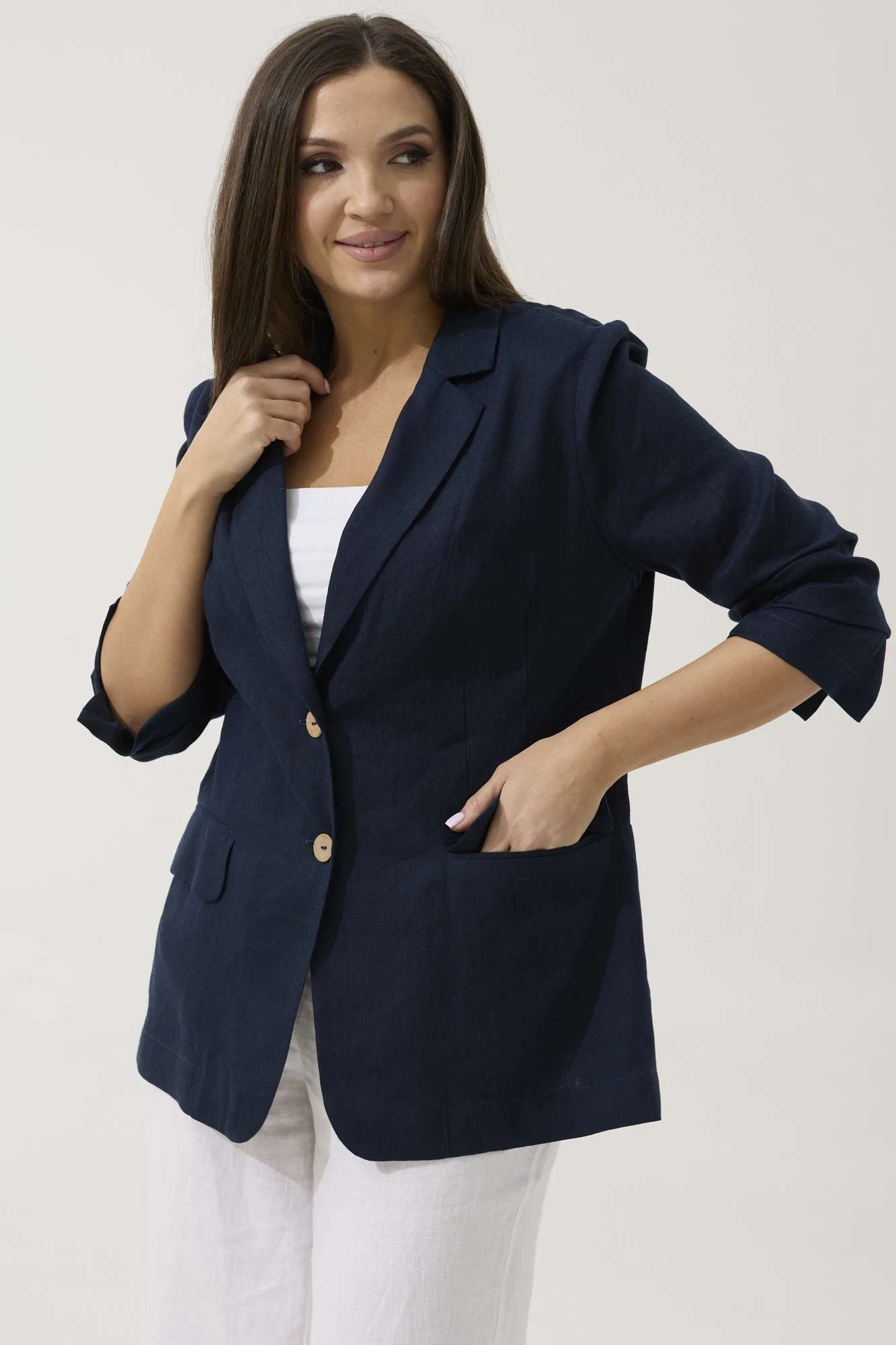Наш жакет смело можно надеть в офис, на деловую встречу, также подойдет для повседневного использования. Будет идеально смотреться с нашими льняными брюками 2050 (на фото), также обе модели можно приобрести комплектом 3052.