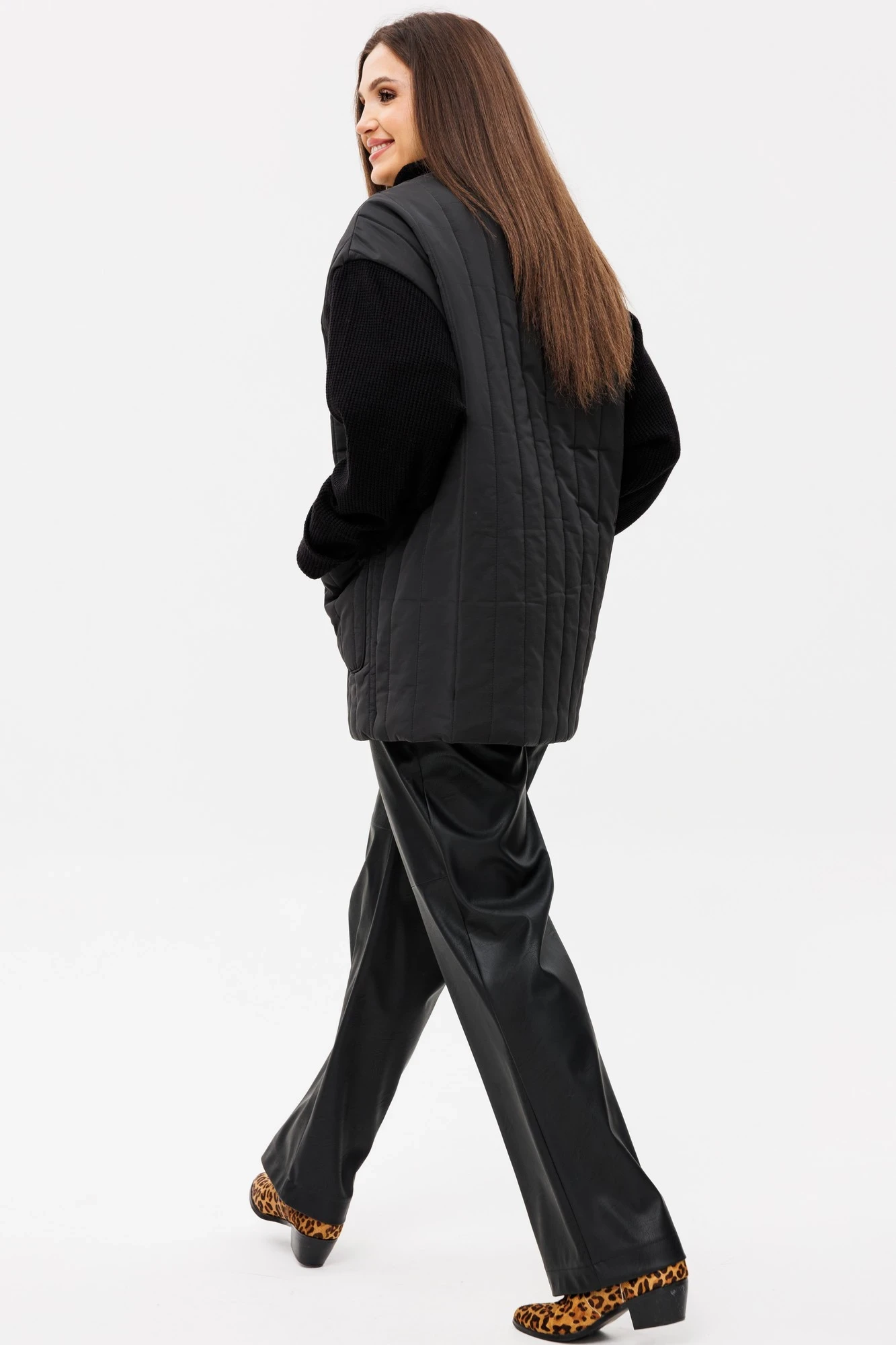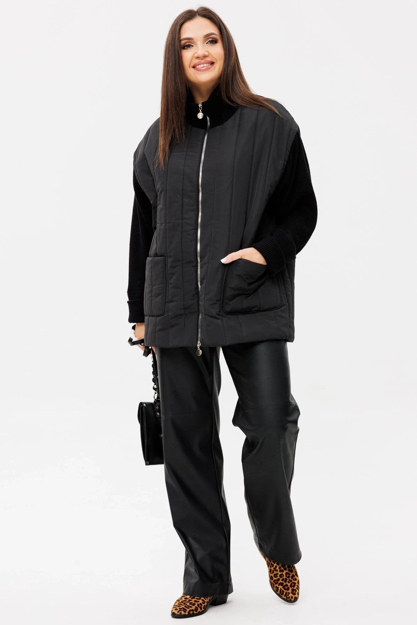 Жакет будет идеально смотреться с нашими кожаными брюками 2073 (на фото) или джинсами 2065 и 2066. Образ будет актуален в повседневном использовании.
