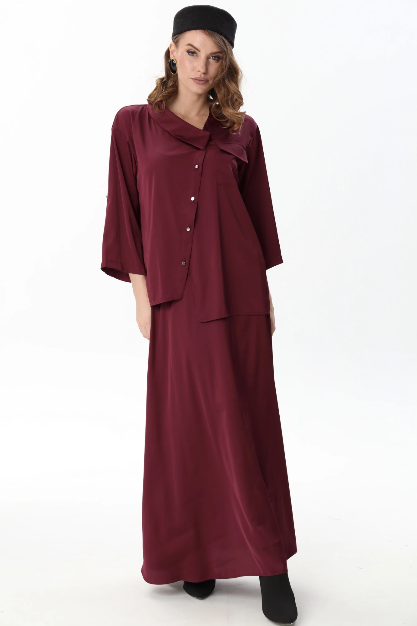 Жакет рубашечного типа прямого силуэта с асимметричным низом. Рукав втачной со спущенной линией плеча, фиксируется на пату. Застежка центральная на петли и пуговицы, смещённая по косой. На левой полочке накладной карман с клапаном. Воротник отложной на стойке до половины спинки.