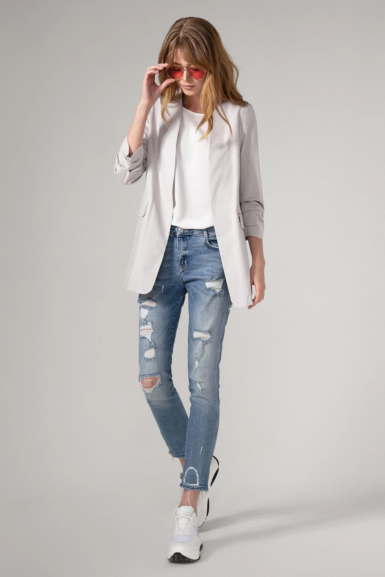 Стильный модный жакет из льняной ткани в стиле "кэжуал". Это повседневный удобный и практичный жакет, который отлично сочетается как с джинсами, так и с брюками. Жакет удлиненный, без застежки, рукава длиной ниже локтя. По переду имеются карманы. Спинка со средним швом, который заканчивается шлицей. Жакет без подкладки.