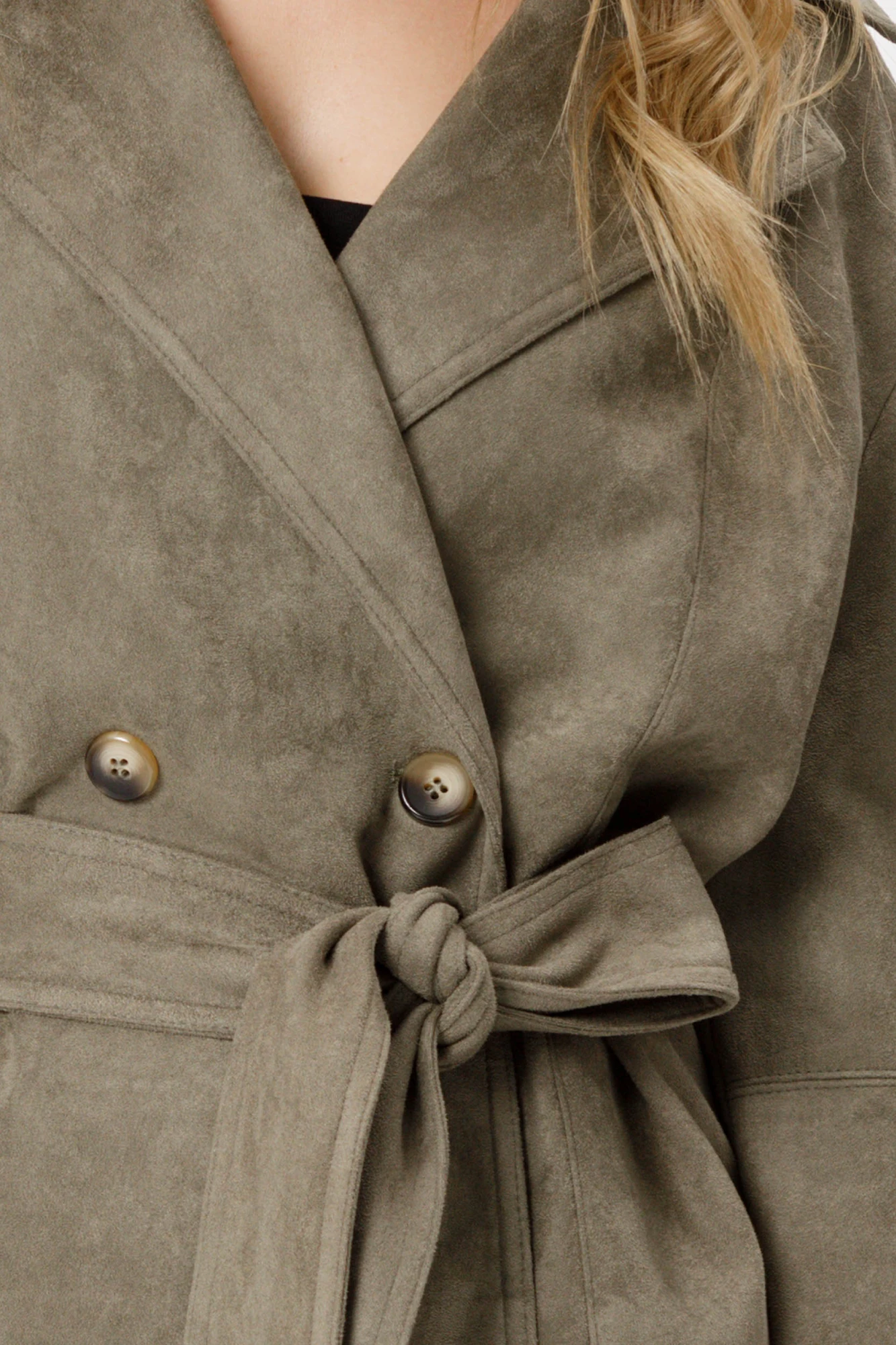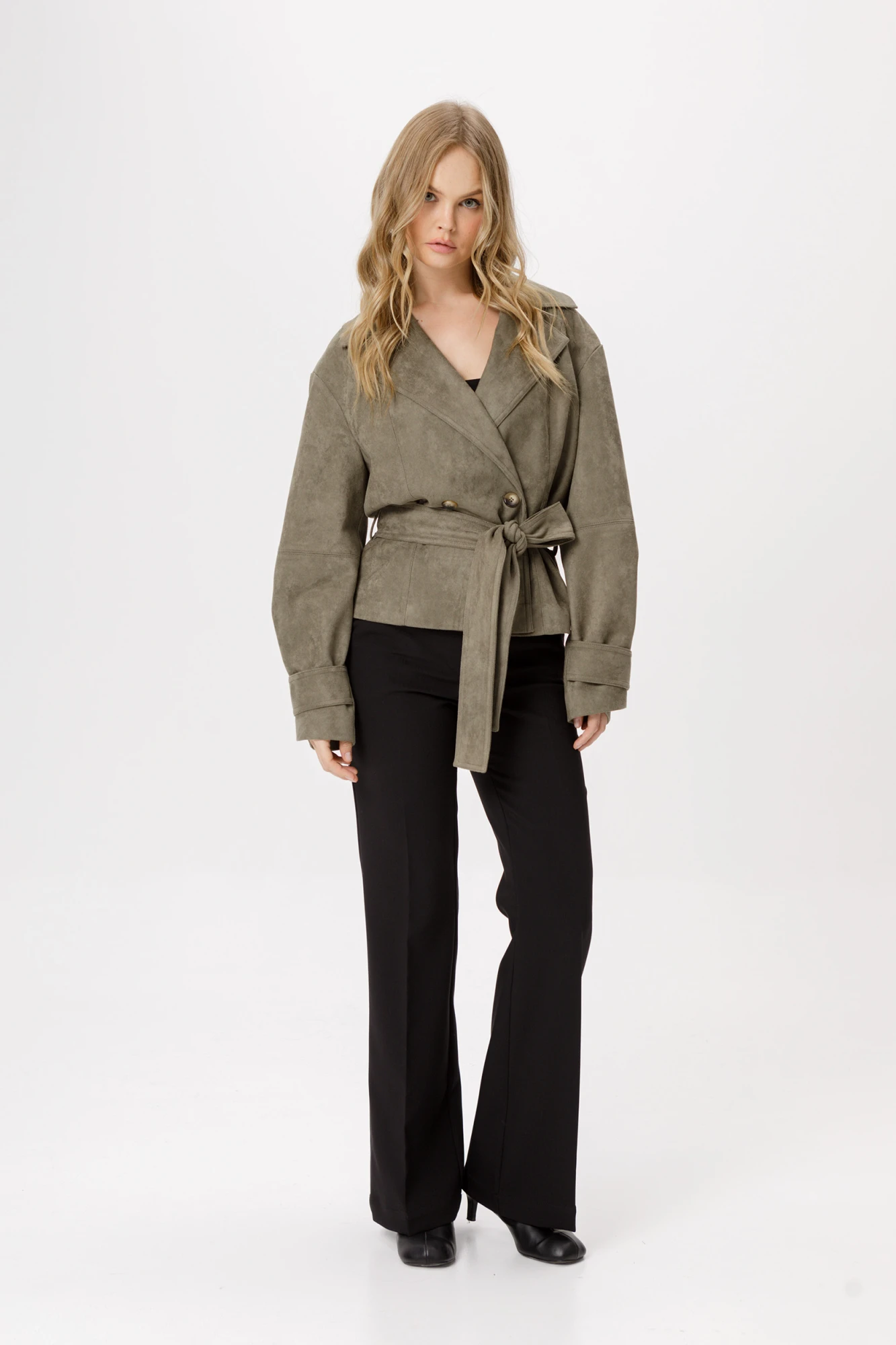 Детали: прямой силуэт, спущенные плечи, пиджачный воротник, рельефные швы по переду и спинке, кокетка спинки, рукава втачные, смещённая застёжка на петлю и пуговицу, съемный пояс, жакет на подкладке.
