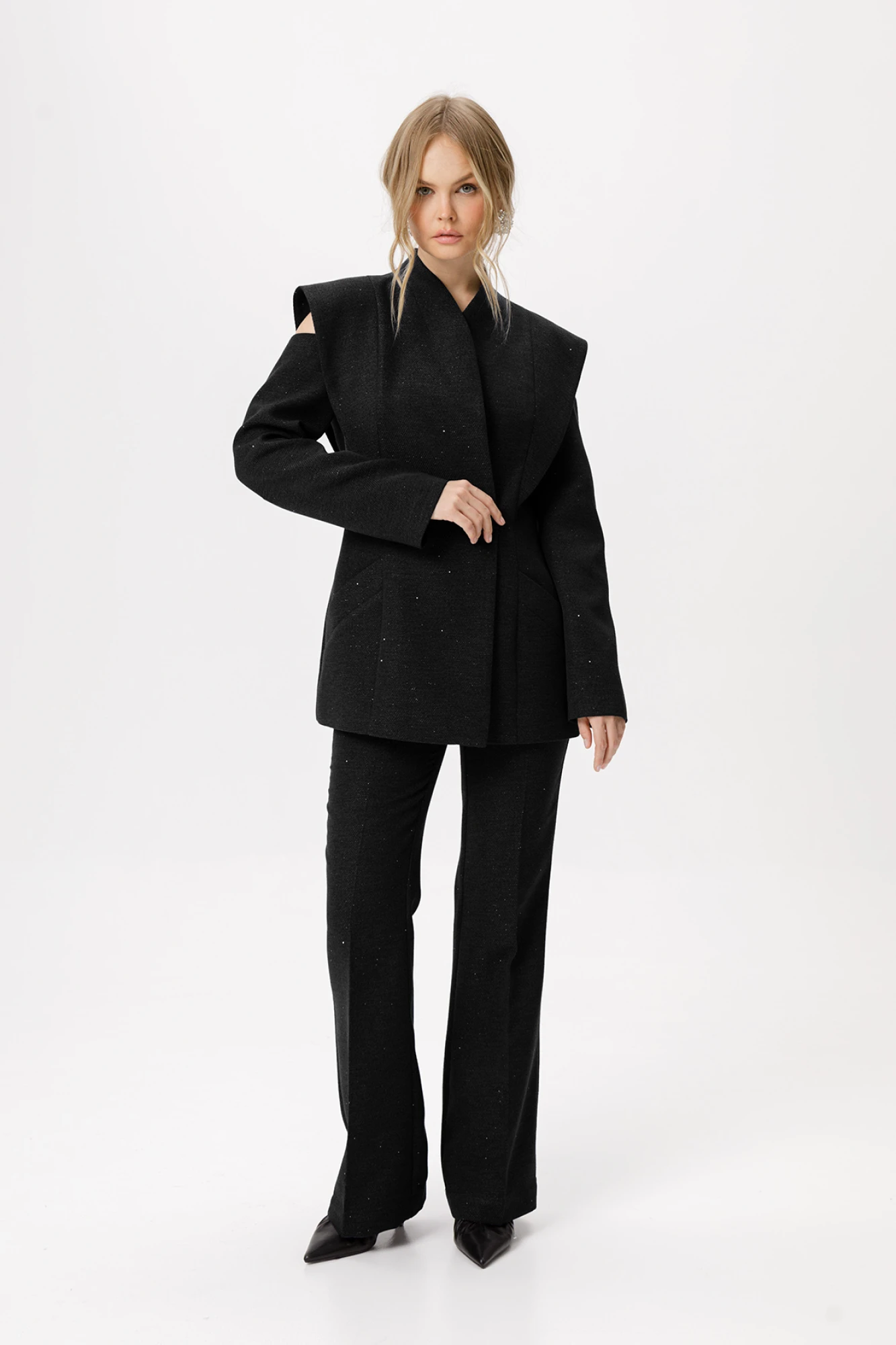 Детали: полуприлегающий силуэт, цельнокроеный воротник-стойка, двубортная застёжка на петли и пуговицы, рельефные швы переда и спинки с декоративным элементом, рукава длинные с вырезами по верху, функциональные карманы, жакет на подкладке.