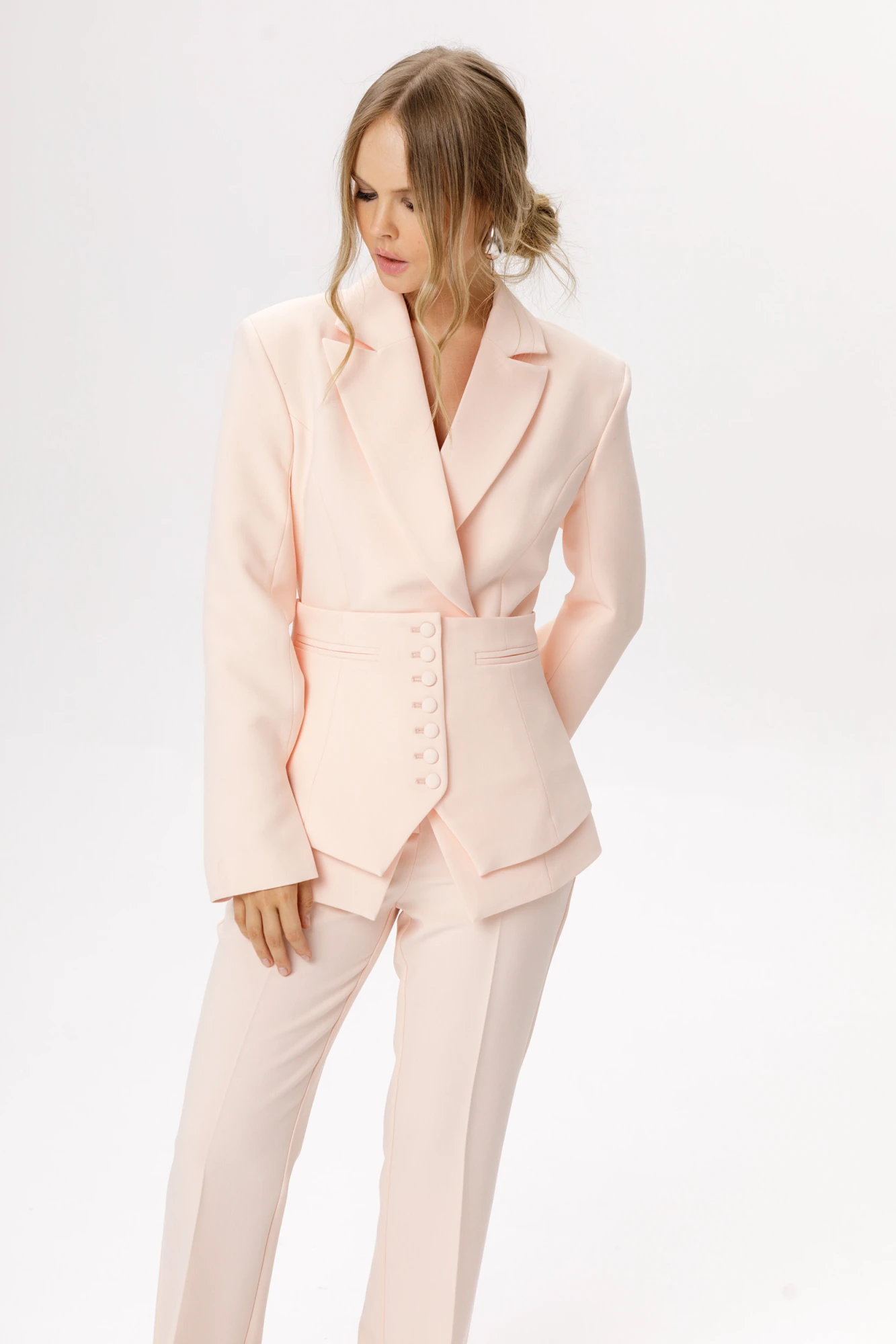 Комплект-двойка из приталенного жакета с разрезами по рукавам и съёмной баски (приобрести брюки с фото можно по арт. 6343, приобрести жакет с фото без баски 6539).