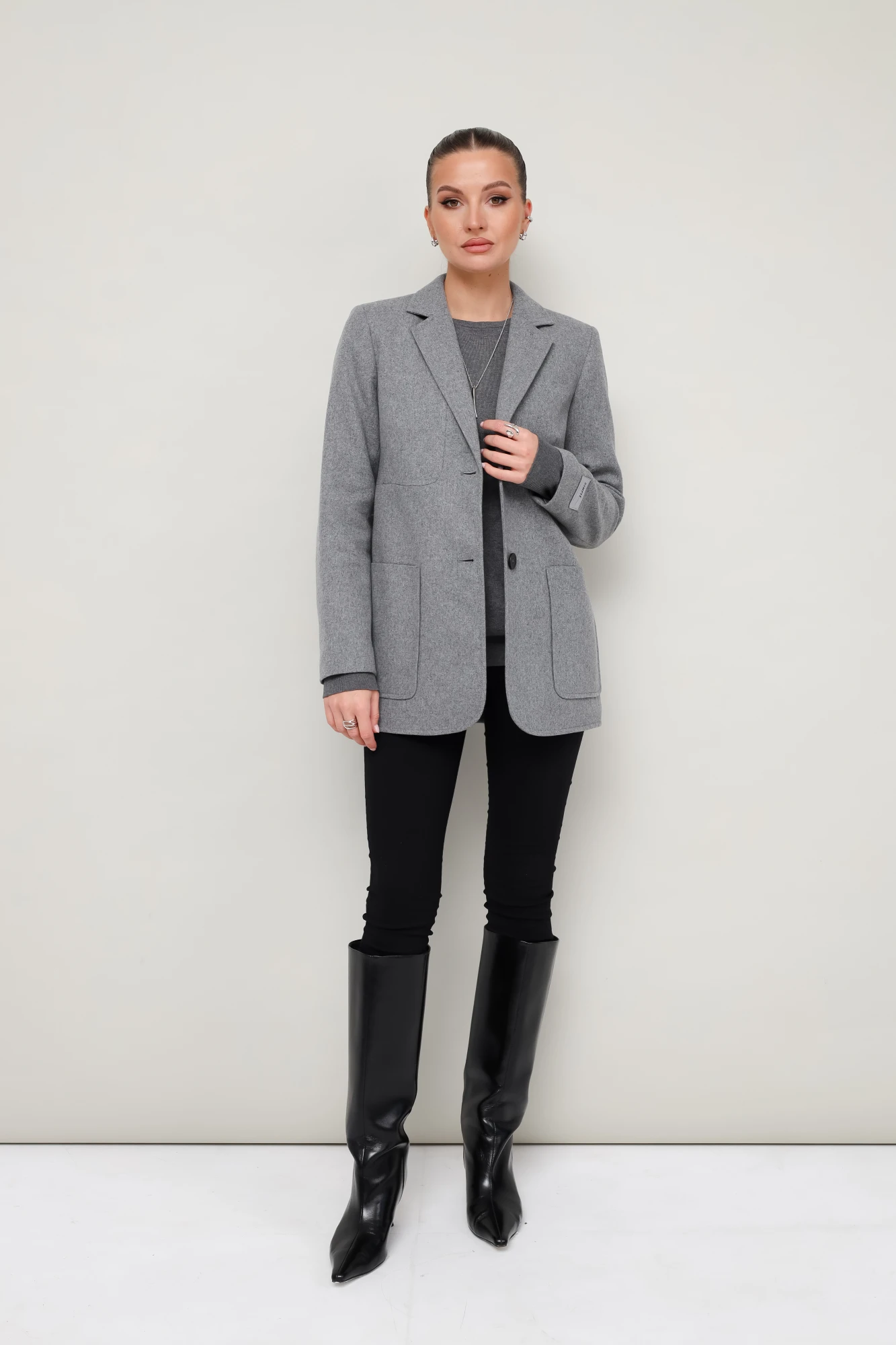 Стильный жакет полуприлегающего силуэта, выполнен из костюмной ткани. Воротник пиджачного типа с отложными лацканами. Застежка центральная на петли и пуговицы. Спереди обработаны накладные карманы, в области груди подрезы с нагрудными вытачками. Спинка с рельефами и средним швом, переходящим в шлицу. Рукава втачные двухшовные, на левом рукаве декоративная нашивка. Изделие на подкладке.