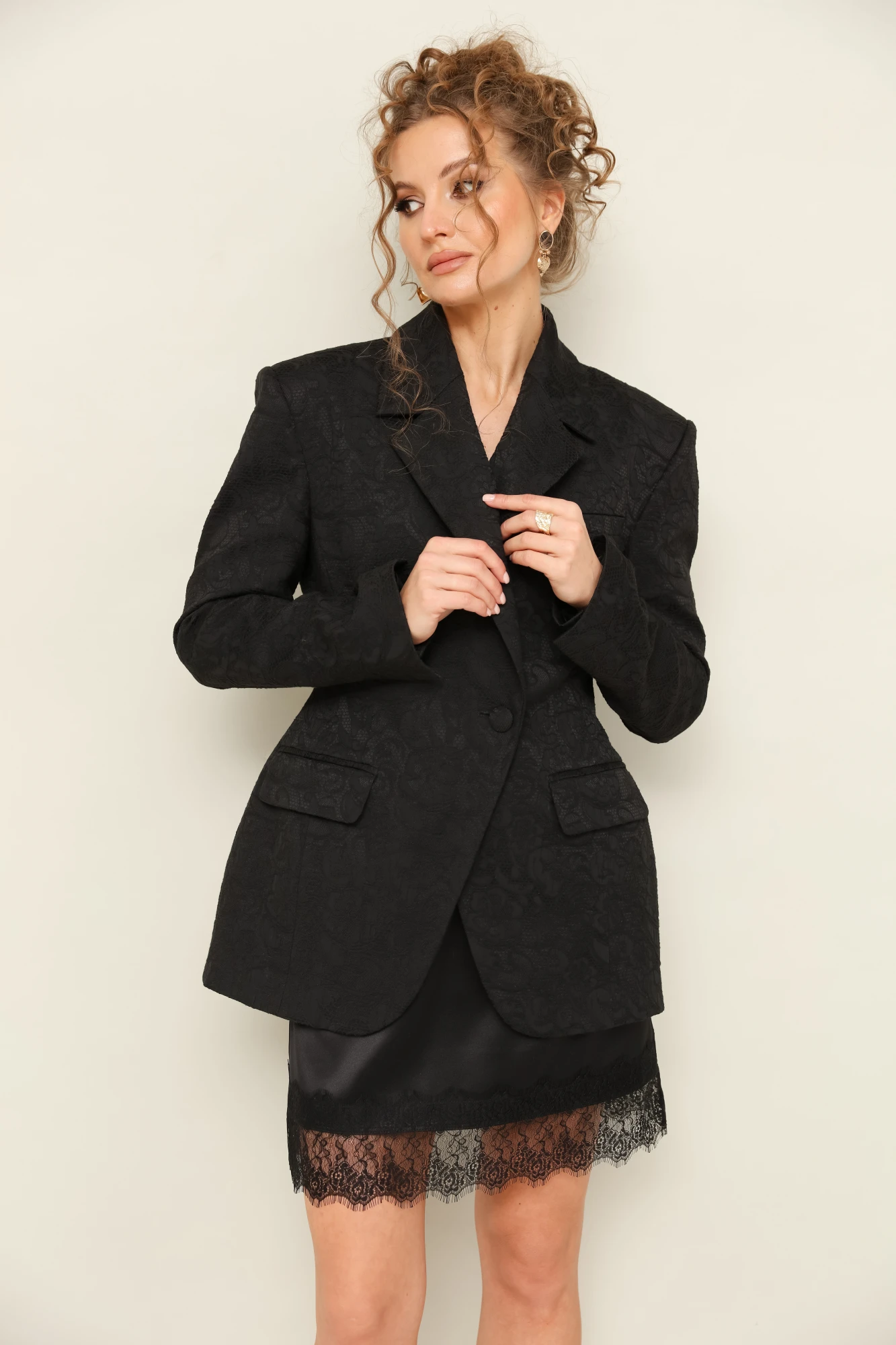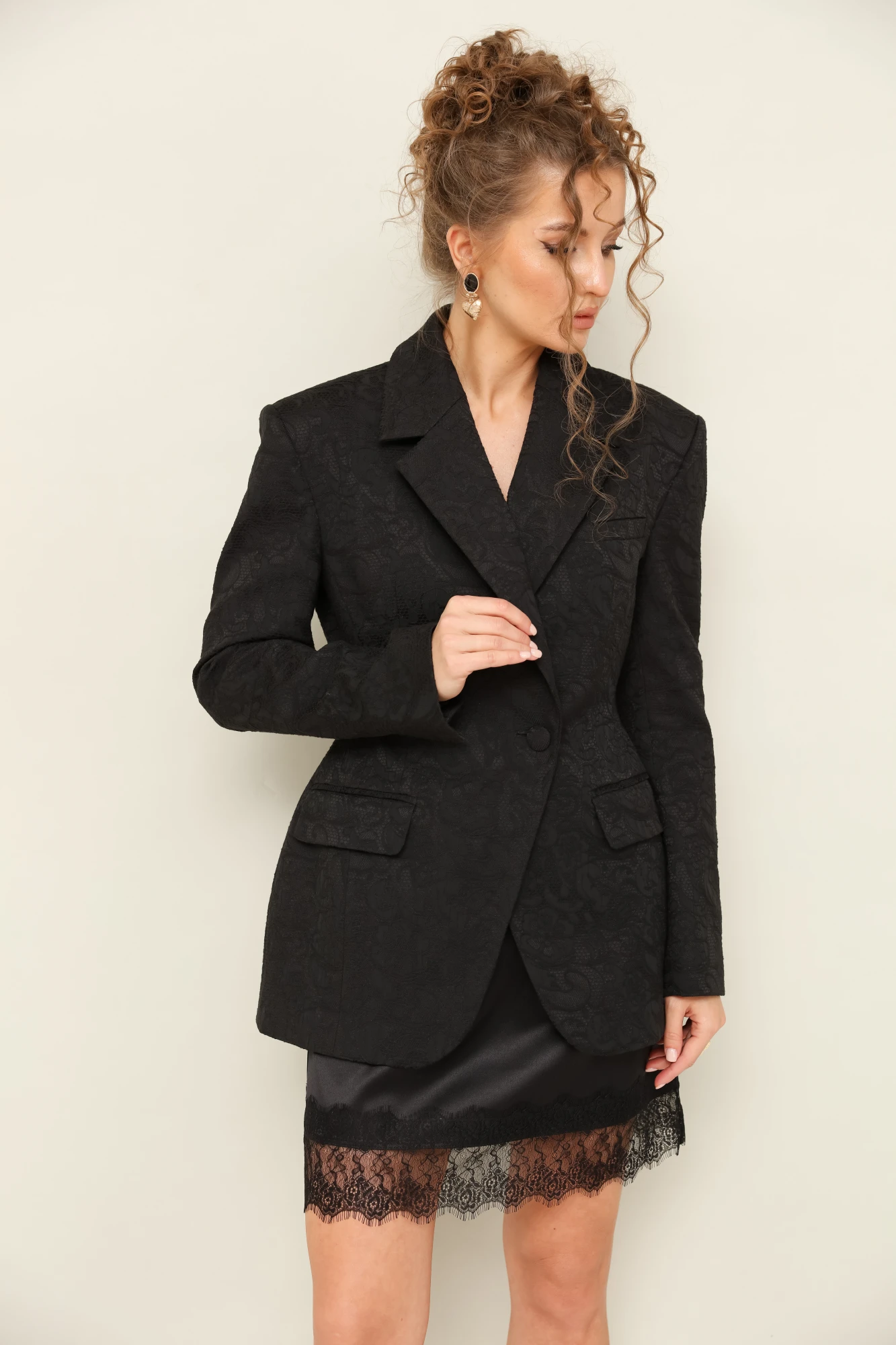 Силуэтный жакет с подчеркнутой линией талии, выполнен из жаккарда. Смещенная застежка на петлю и обтяжную пуговицу. Воротник пиджачного типа с отложными лацканами, край борта скругленный по низу жакета. Спереди обработаны прорезные карманы в рамку с клапанами и нагрудный прорезной карман с листочкой. Рукава втачные, двухшовные с отлетнымм шлицами. Спинка с рельефами и средним швом, переходящим в шлицу. Жакет на подкладке.