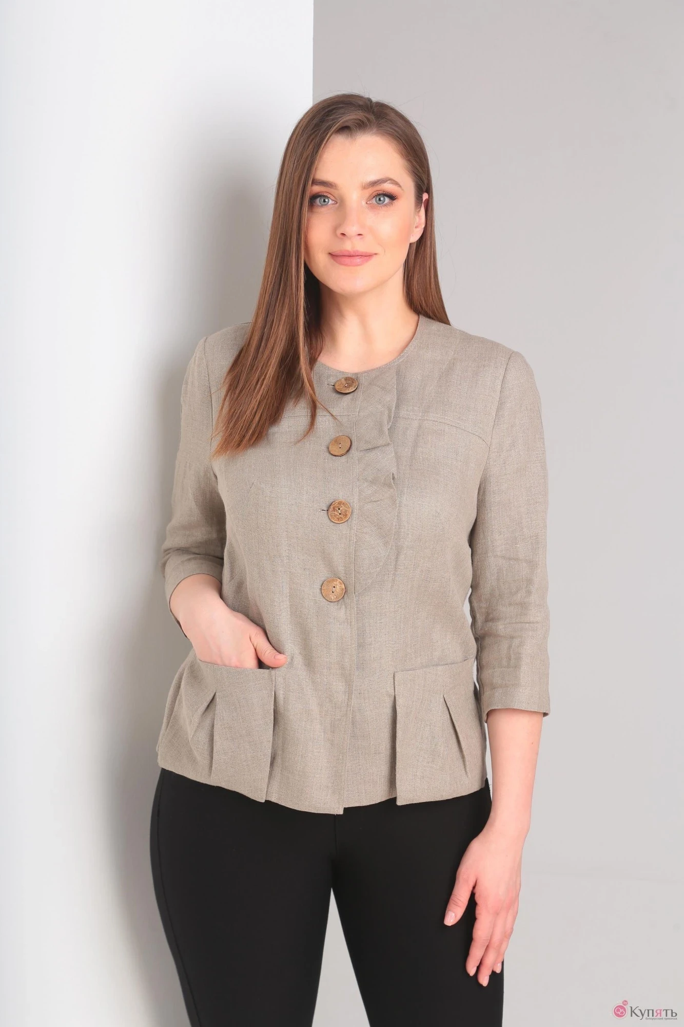 Жакет прямого силуэта без подкладки с отлетными накладными карманами. Борт жакета обработан декоративной рюшей. Рукав двухшовный 3/4. застежка центральная на петли, пуговицы