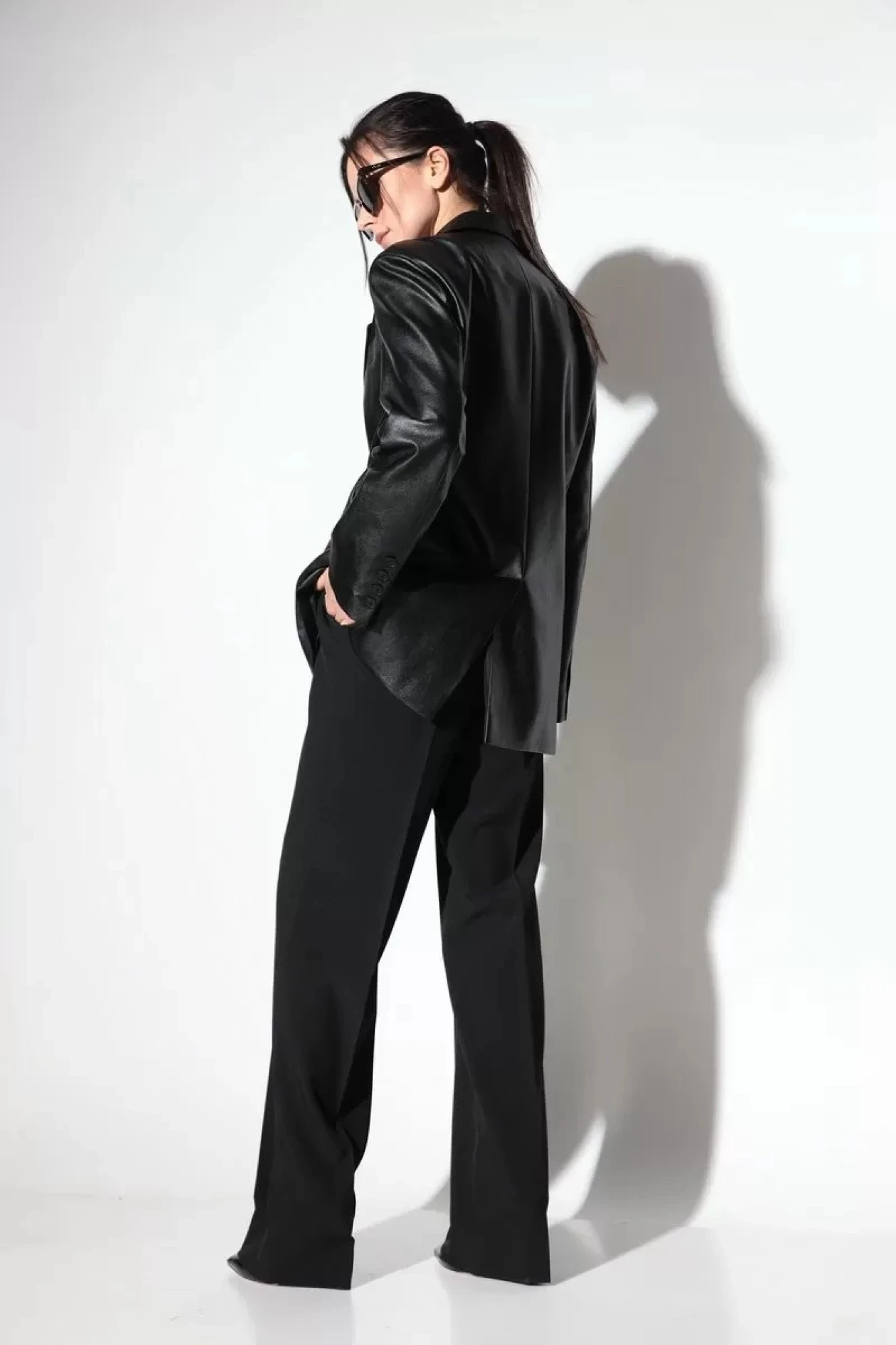 Современный, стильный пиджак unisex из эко-кожи, - базовый элемент гардероба. Трендовый пиджак прямого силуэта, линия плеч слегка спущена, застежка двубортная , воротник пиджачного типа с отложным лацканом. Спереди прорезные карманы в рамку с клапаном, на левой стороне полочки листочка. Спинка со средним швом и отлетной шлицей (24.5 см.). Рукав втачной, двухшовный, со шлицей на пуговицах. Изделие на подкладке. Универсальный пиджак станет отличной долгосрочной инвестицией.