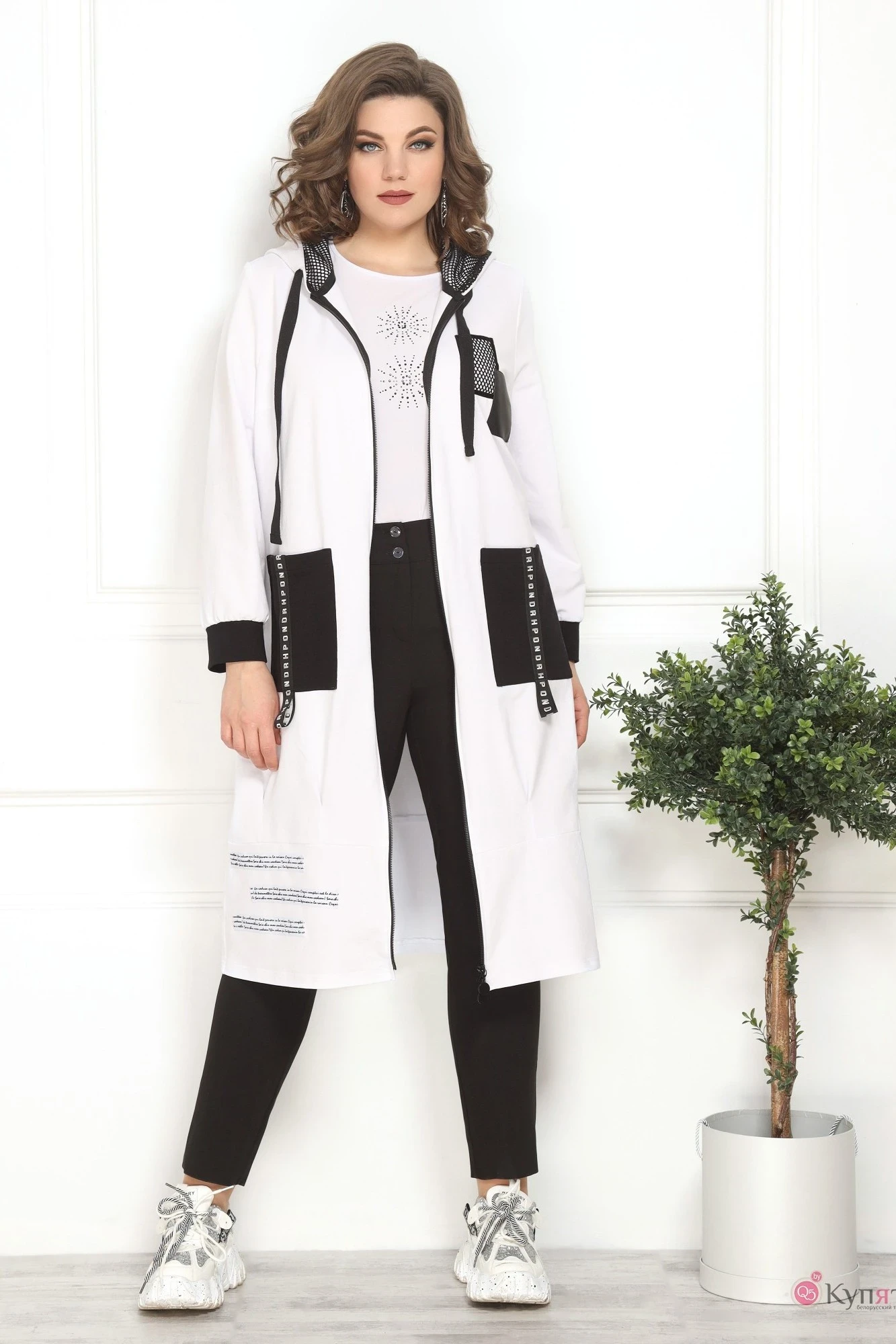 Удлиненный, мягкий жакет из трикотажного хлопкового полотна. Свободного силуэта, чуть зауженный к низу. По переду нагрудные выточки, действующие накладные карманы также выполнены из трикотажного полотна и украшены декоративной тесьмой. По нижней части изделия и по спинке отрезная деталь от которой застрочены 4 складки. Украшением изделия служит настроченная тесьма в верхней части спинки и по нижней части по переду. Изделие с капюшоном на завязках. Жакет на молнии. Рукав втачной, длинный, одношовный с манжетой. Подойдет для женщин разной возрастной категории и разного телосложения. Длина рукава в 50р-60см, длина изделия по среднему шву в 50р-105см.