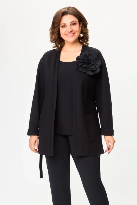 Жакет женский свободного прямого силуэта, длиной ниже линии бедер. Жакет трикотажный, без подкладки со съемным поясом и накладными карманами. По переду и горловине спинки притачная планка, без застежки. Линия плеча слегка спущена. Рукав втачной длинный с отложной манжетой. В боковых швах разрезы. Украшен жакет съемным цветком из отделочной ткани.