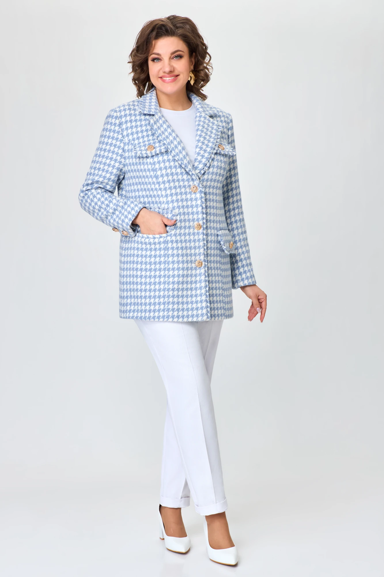 Жакет женский прямого силуэта, длиной ниже линии бедер, с втачным рукавом. Застежка центральная на три петли и пуговицы, воротник отложной с лацканами. По переду рельефные швы. Верхняя часть переда с декоративным клапаном, нижняя часть переда с прорезными карманами с клапаном. Спинка со средним швом. Рукав длинный двухшовный, по низу декоративная шлица. По краю борта, лацканов воротника, клапанов отделка - бахрома. Жакет на подкладке.
