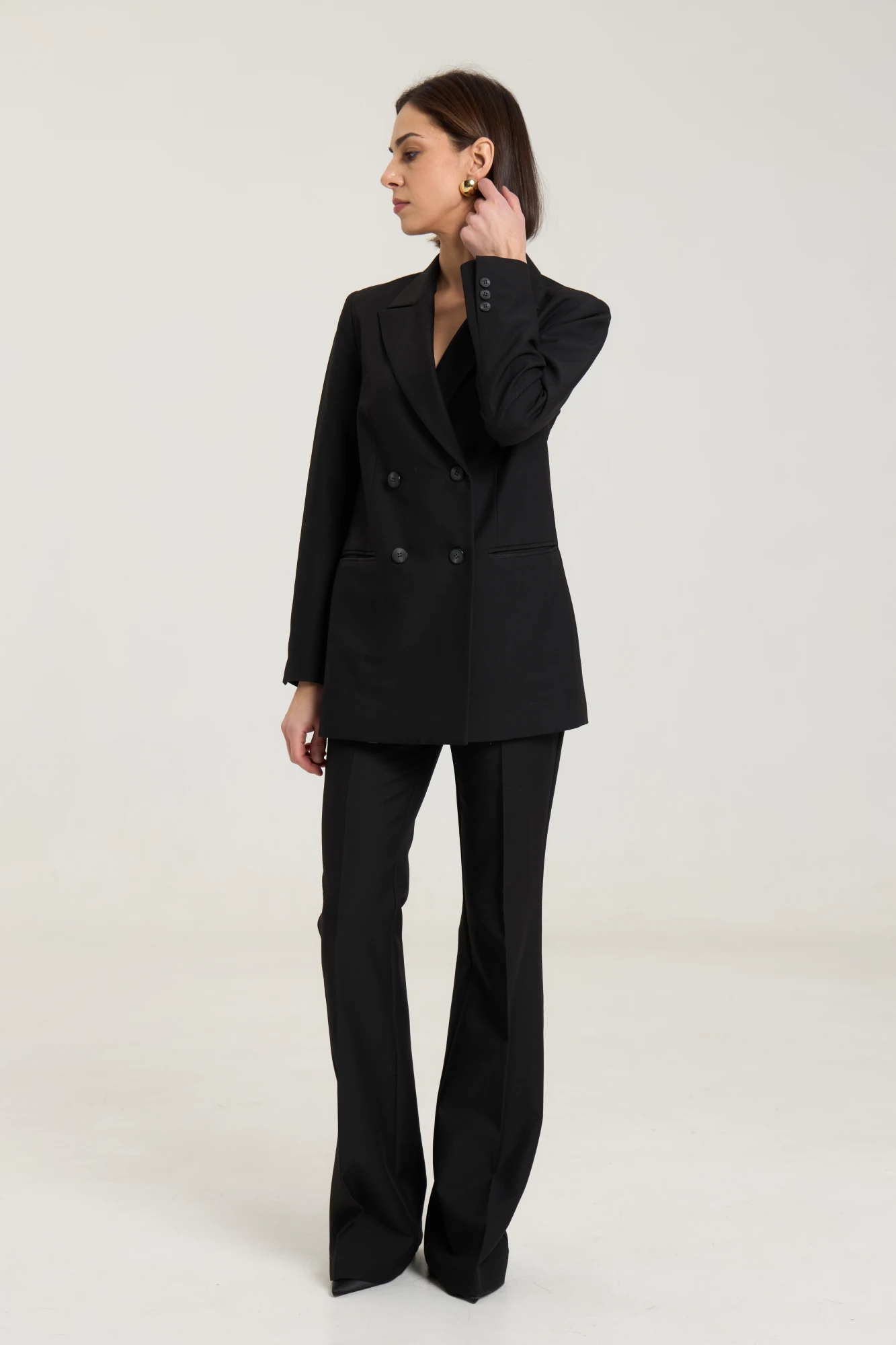 Жакет пошит таким образом, чтобы в нем было комфортно женщине любого возраста, с любыми формами.Жакет двубортный, с нагрудными выточками, прорезные карманы в рамку с клапанами, застежка на петли и пуговицы, спинка со средним швом, втачные двухшовные рукава, с тремя отделочными пуговицами,жакет на подкладке. Выполнен из премиальной ткани костюмной группы.