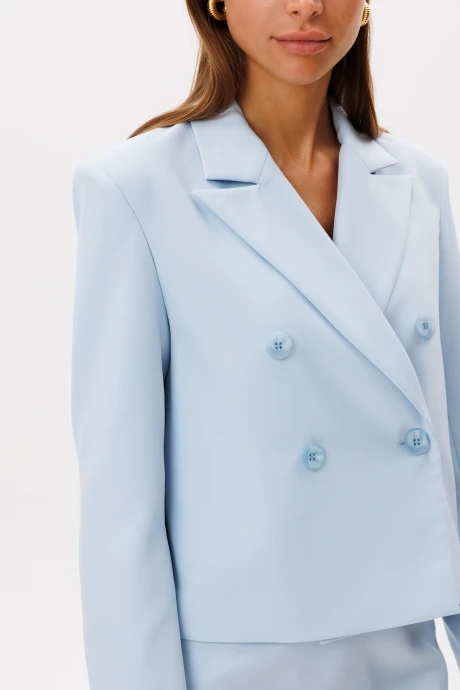 "Двубортный жакет, прямого силуэта,на подкладке из вискозы, шлицы на рукавах с декоративными пуговицами, рукав втачной, выполнен из премиальной ткани костюмной группы.