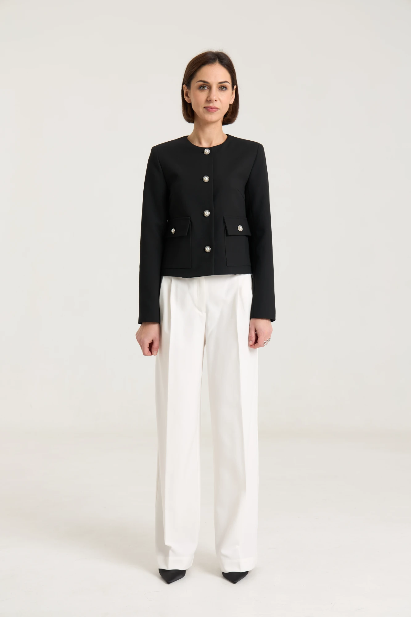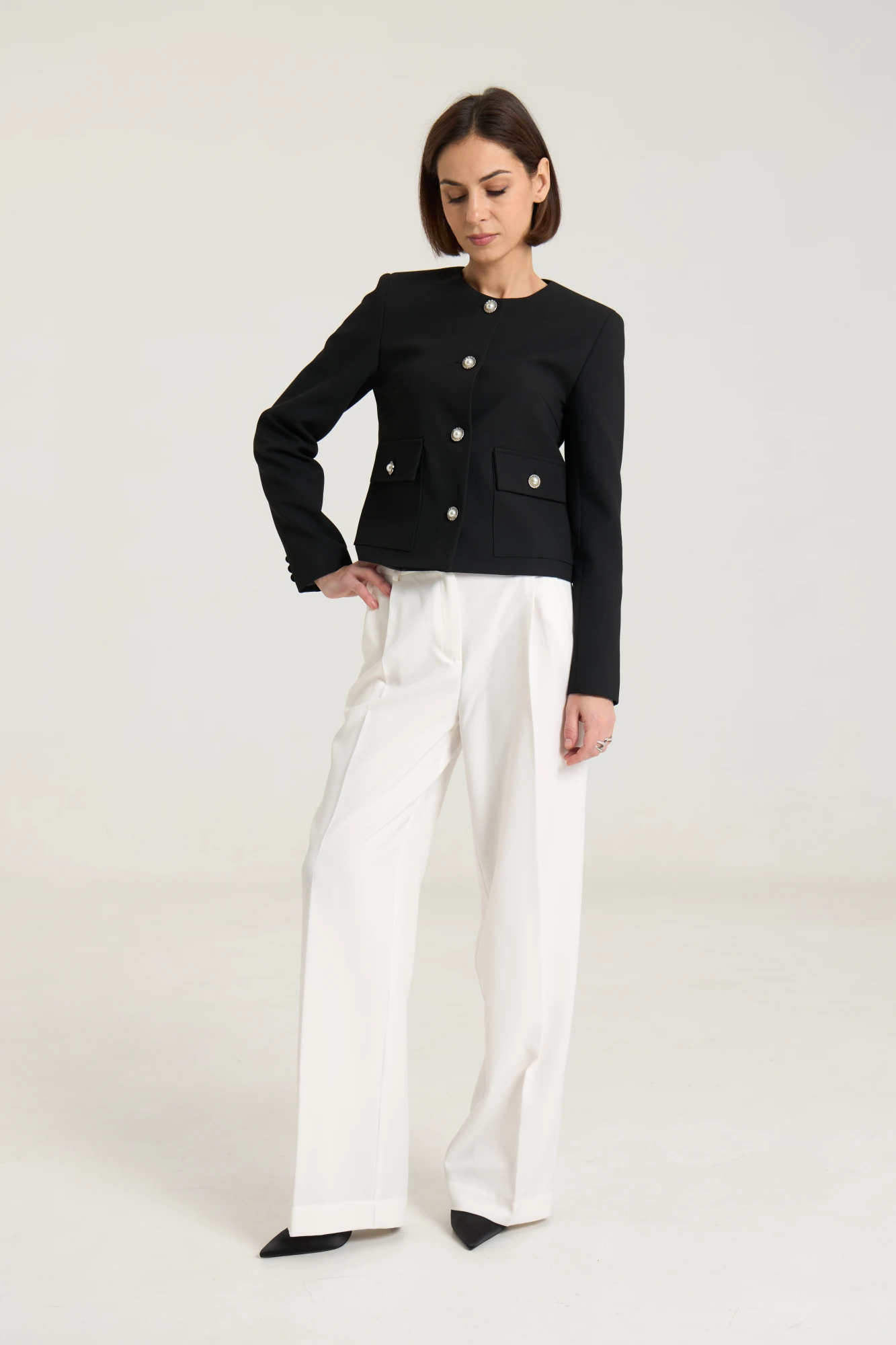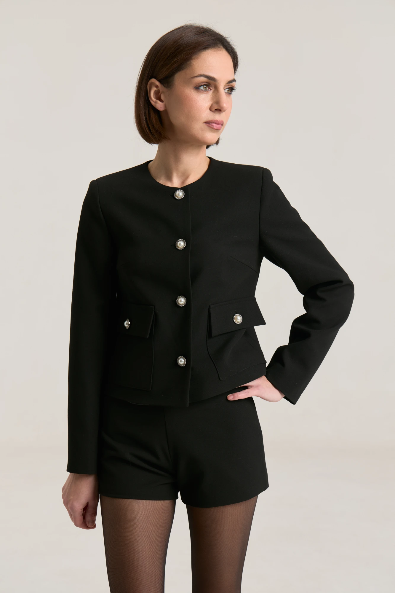"Жакет укороченный, , прямого силуэта, с втачными рукавами , горловина округлой формы, без воротника.По бокам накладные функциональные карманы с застежкой на петлю-пуговицу. Застёжка жакета центральная однабортная на петли и пуговицы. спинка со средним швом и рельефами без шлиц и пуговиц. Жакет на подкладке.